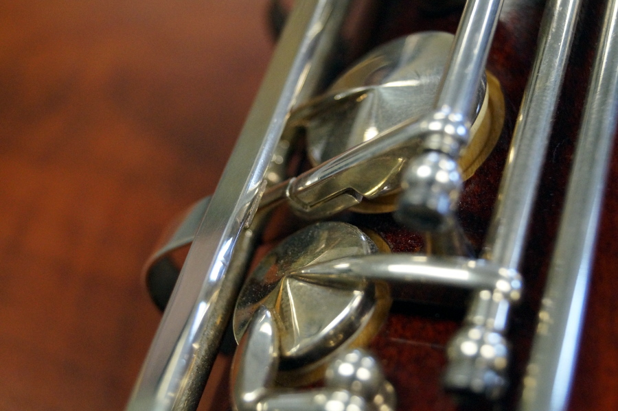 So now came the part about doing the modification. I had Eric Anderson do the work at Midwest Musical Imports. The first step was easy: remove the Ab/Bb key and posts. Get them out of the way. Then the new arms were made and soldered to the existing mechanism. Finally, re-assembly and adjustment of the springs in such a way that the keys were regulated and doing what was intended.