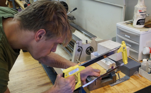 Cutting raw key stock for the little tabs that will control the mechanism.